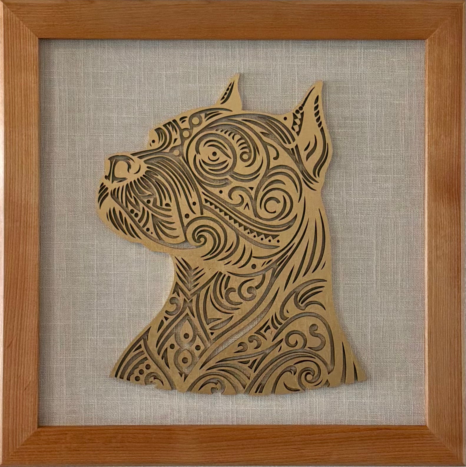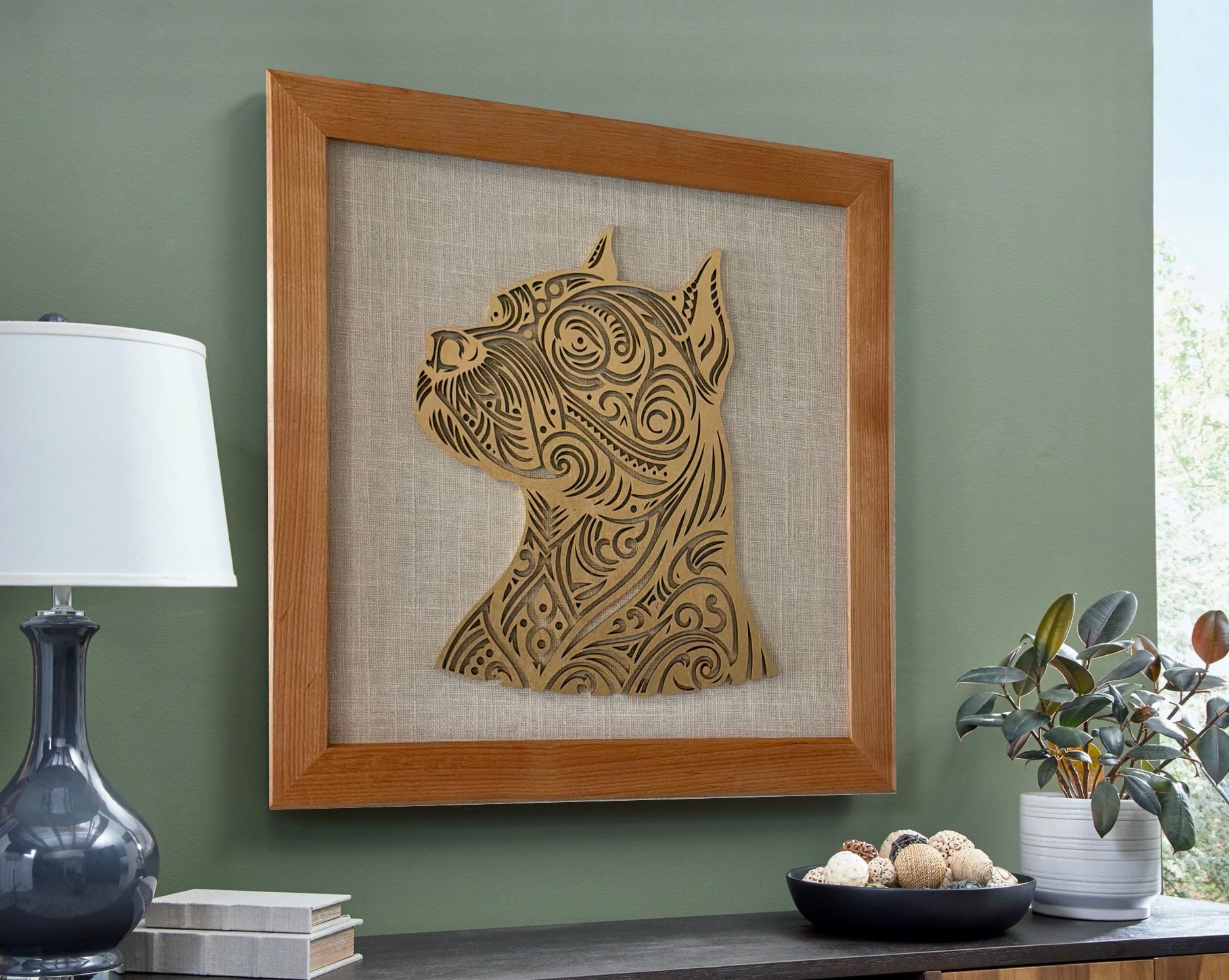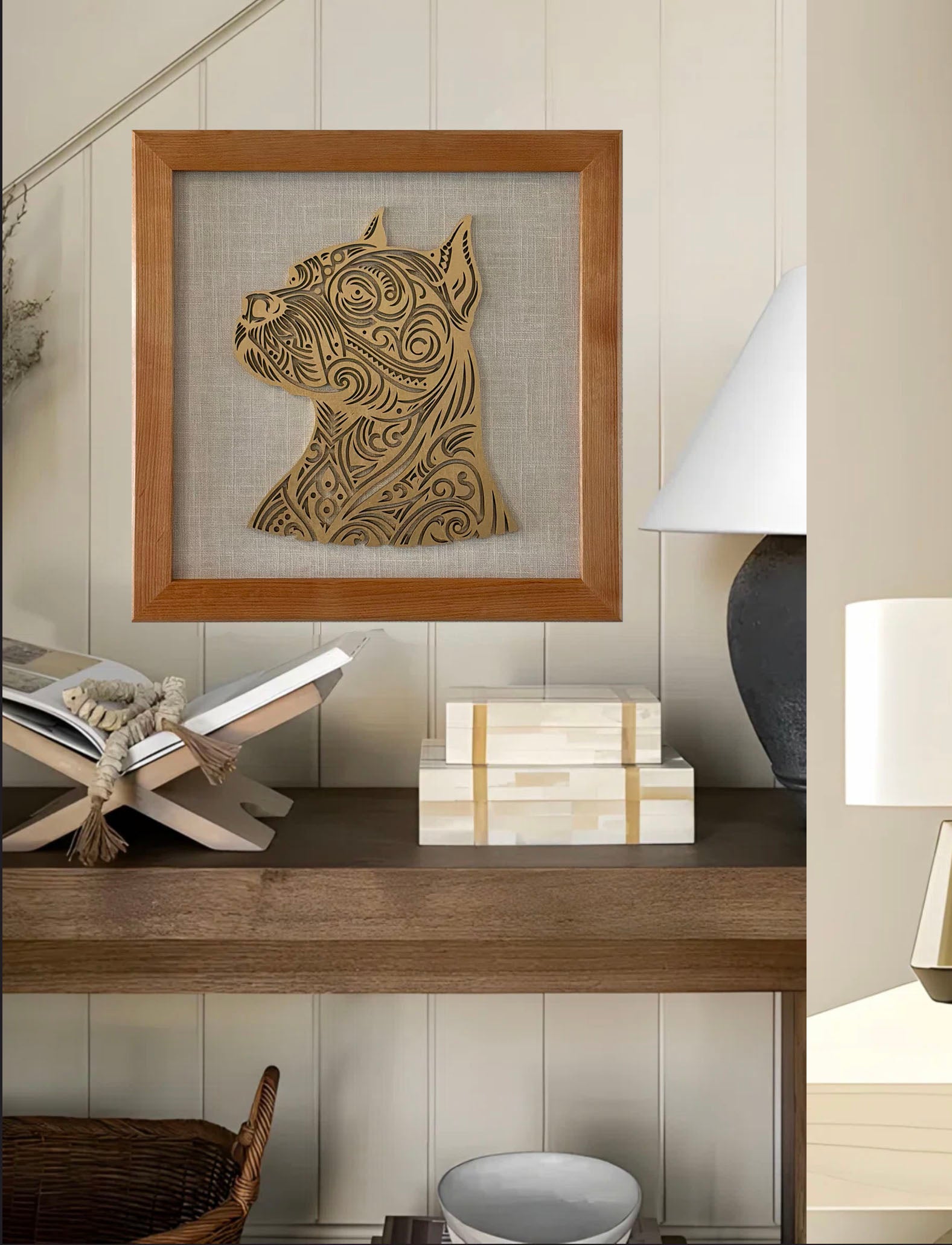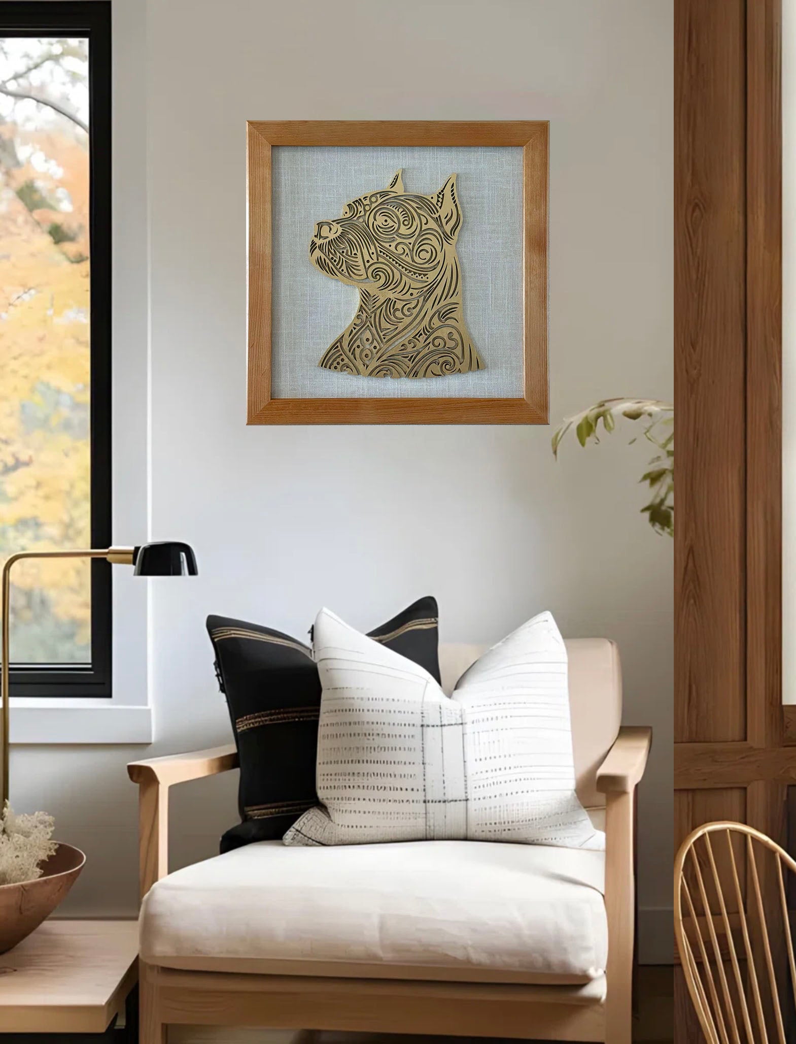 24" x 24" Handmade selected Alder wood frame with walnut insets details. Premium wallpaper backing and gold painted laser cut wood design.